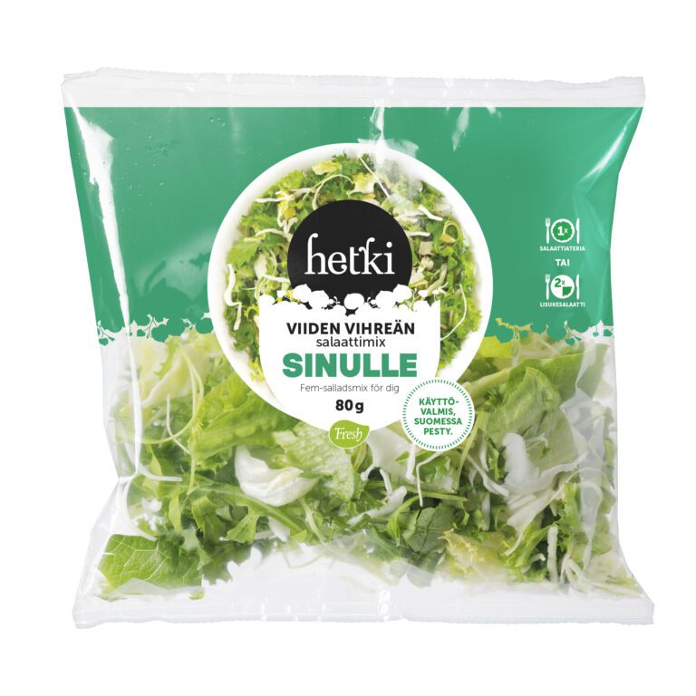 Viiden vihreän salaattisekoitus, jossa jäävuorisalaattia, kaalta, friseetä, romanoa ja rucolaa. Valmiiksi pesty ja leikattu salaattisekoitus pohjaksi yhden hengen salaattiateriaan tai kahdelle lisukkeeksi aterialle.