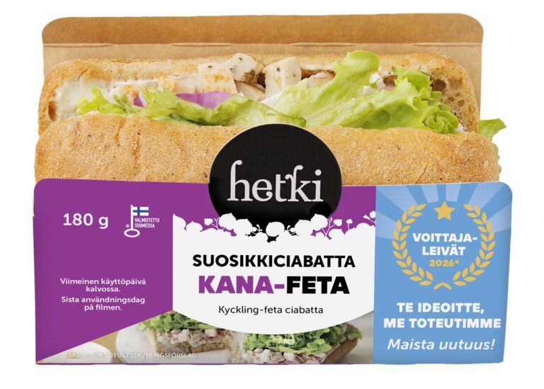 Tumma ciabattaleipä 39 % (VEHNÄJAUHO, vesi, VEHNÄPROTEIINI, RUISJAUHO, rapsiöljy, auringonkukansiemenet, pellavansiemenet, VEHNÄHIUTALEET, OHRA-, VEHNÄ- ja RUISMALLAS, hiiva, suola, hapettumisenestoaine (E300)), crème fraiche-jogurttikastike 22 % (RANSKANKERMA, JOGURTTI, rapsiöljy, vesi, sitruunatäysmehu (tiivisteestä), sokeri, sinappi (vesi, sokeri, SINAPINSIEMEN, etikka, jodioitu suola, rypsiöljy, väri (E150a), valkopippuri), punaviinietikka, KANANMUNANKELTUAISJAUHE, suola, mustapippuri, säilöntäaineet (E202, E211), sakeuttamisaineet (E412, E415)), maustettu broileri 15 % (broilerinfilee (EU), vesi, tapiokatärkkelys, suola, maltodekstriini, mausteseos (suola, dekstroosi, mausteet, aromi, mausteuutteet)), pikkelöity punasipuli (punasipuli, pikkelöintiliemi (vesi, sokeri, väkiviinaetikka, säilöntäaine (E202)), korianteritahna), lehtisalaatti, FETAJUUSTO 7 %