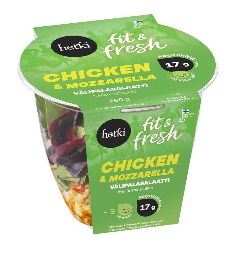Chicken & Mozzarella välipalasalaatti tuo ripauksen Italiaa kiireiseen arkeen. Helppo syödä ja miellyttävän kevyt, mutta silti täyttävä proteiinimääränsä ansiosta. Pehmeä fusillapasta muodostaa ruokaisan pohjan, jota täydentävät broileri, herkulliset mozzarellahelmet, mehukas tomaatti, pinaatti ja viinijuurikas. Täyteläinen pesto, sitruuna ja ruohosipuli viimeistelevät tämän herkullisen salaatin.