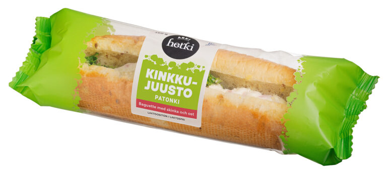 Moniviljapatonki 50 % (VEHNÄJAUHO, vesi, siemensekoitus (maissihiutale, pellavansiemen, SOIJA, auringonkukansiemen, hirssi, OHRAMALLAS, VEHNÄGLUTEENI, VEHNÄJAUHO, sokeri, emulgointiaine (E472e), VEHNÄMALLAS, entsyymit, jauhonparanne (E300)), sokeri, rapsiöljy, hiiva, mallasjauho (OHRA, VEHNÄ), VEHNÄGLUTEENI, glukoosi, suola, VEHNÄHAPANTAIKINA), kinkku-juustotäyte (majoneesi (rypsiöljy, vesi, KANANMUNA, etikka, KANANMUNANKELTUAINEN, sokeri, suola, sitruunamehutiiviste, aromi, hapettumisenestoaine (E385)), kinkkuvalmiste 13 % (siankinkku (EU), vesi, muunnettu maissitärkkelys, suola, stabilointiaineet (E407, E451, E450), maltodekstriini, happamuudensäätöaine (E261), dekstroosi, hapettumisenestoaine (E316), savuaromi, säilöntäaine (E250 natriumnitriitti)), JUUSTO 7 %, maustekurkku (kurkku, vesi, etikka, sokeri, suola, säilöntäaineet (E211, E202), stabilointiaine (E509), luontaiset aromit), muunnettu maissitärkkelys), lehtisalaatti