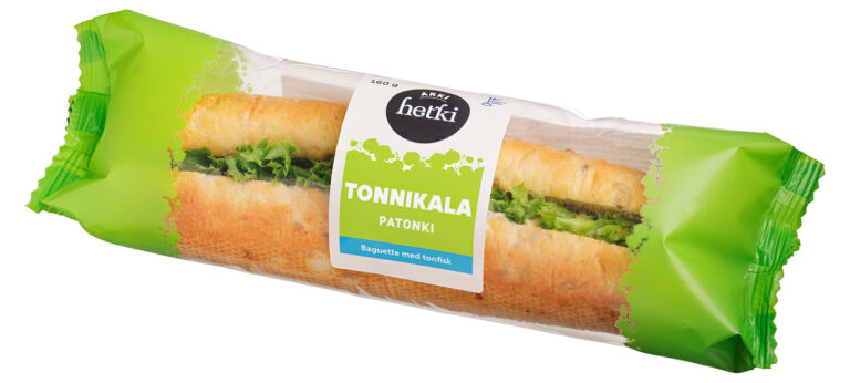 Moniviljapatonki 50 % (VEHNÄJAUHO, vesi, siemensekoitus (maissihiutale, pellavansiemen, SOIJA, auringonkukansiemen, hirssi, OHRAMALLAS, VEHNÄGLUTEENI, VEHNÄJAUHO, sokeri, emulgointiaine (E472e), VEHNÄMALLAS, entsyymit, jauhonparanne (E300)), sokeri, rapsiöljy, hiiva, mallasjauho (OHRA, VEHNÄ), VEHNÄGLUTEENI, glukoosi, suola, VEHNÄHAPANTAIKINA), tonnikalatäyte (majoneesi (rapsiöljy, KANANMUNANKELTUAINEN, väkiviinaetikka, vesi, SINAPPI (väkiviinaetikka, SINAPINSIEMEN, vesi, suola, kurkuma), suola, sakeuttamisaineet (E412, E415), aromi, hapettumisenestoaine (E385)), tonnikala 20 % (TONNIKALA (Katsuwonus pelamis), auringonkukkaöljy, suola), maustekurkku (kurkku, vesi, etikka, sokeri, suola, säilöntäaineet (E211, E202), stabilointiaine (E509), luontaiset aromit), punasipuli, tilli, sitruunamehu (vesi, sitruunamehutiiviste, säilöntäaine (E224 KALIUMDISULFIITTI)), muunneltu maissitärkkelys, mustapippuri), lehtisalaatti. Saattaa sisältää pieniä määriä maitoa.