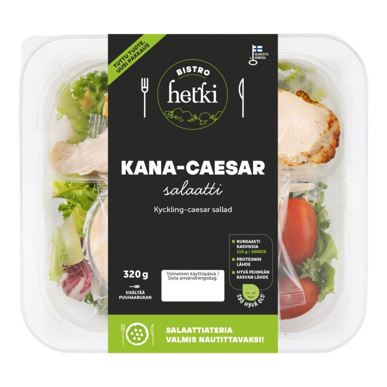 Hetki Bistro Kana-caesarsalaatissa on kanan rintafileetä, tuoreita kasviksia, täysjyväpastaa sekä lisukkeina tietenkin juustolastuja, krutonkeja ja maukas Caesarkastike. Kana-caesarsalaatti sisältää 110 g kasviksia, joka vastaa noin 20 % kasvisten päivittäisestä saantisuosituksesta. Öljypohjainen kastike tekee Kana-caesarsalaatista hyvän pehmeän rasvan lähteen. Salaatissa on mukana haarukka.