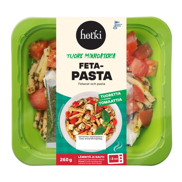 Chilimaustettu pasta 60 % (pasta (vesi, DURUMVEHNÄ), tomaattisalsa (tomaatti, sipuli, sokeri, paprika, inkivääripyree (inkivääri, etikka, soijapapuöljy (allergeeniton), sokeri, suola), sitruunapyree, limetäysmehu (tiivisteestä), appelsiini-balsamico (balsamietikka (valkoviinietikka, rypälemehutiiviste), appelsiinimehutiiviste, appelsiininkuoriuute, aromit), valkosipuli, suola, väkiviinaetikka, peperoni (paprika, vesi, suola, viinietikka), hyytelöimisaine (E440), chili, sakeuttamisaine (E412), säilöntäaineet (E202, E211, KALIUMDISULFIITTI), mustapippuri, happamuudensäätöaine (E330), oregano), rypsiöljy, buffalomausteseos (sipuli, tomaatti, valkosipuli, paprika, chili, mustapippuri, liperi, juustokumina, cayenne, oregano, suola, aromit (hiivauute, kana, paprika, chili, viinietikka), sokeri, dekstroosi, hapettumisenestoaine (E296), rapsiöljy), pinaattihiutale), tomaatti 19 %, fetajuusto 14 % (pastöroitu lampaan- ja vuohenMAITO, suola, hapate, mikrobiologinen juoksute)