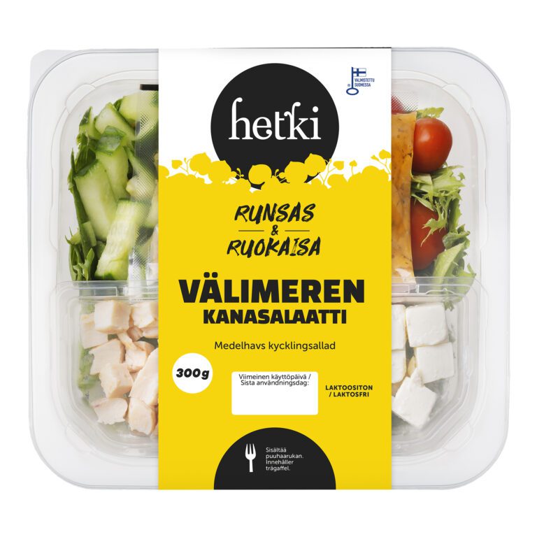Hetki Välimeren kanasalaatti kuuluu Ruokaisat salaattiateriat -sarjaan, jonka annokset sisältävät runsaammin hiilihydraatin lähdettä, kuten pastaa, nuudelia tai riisiä. Näillä salaateilla taltuttaa helposti isommankin nälän!